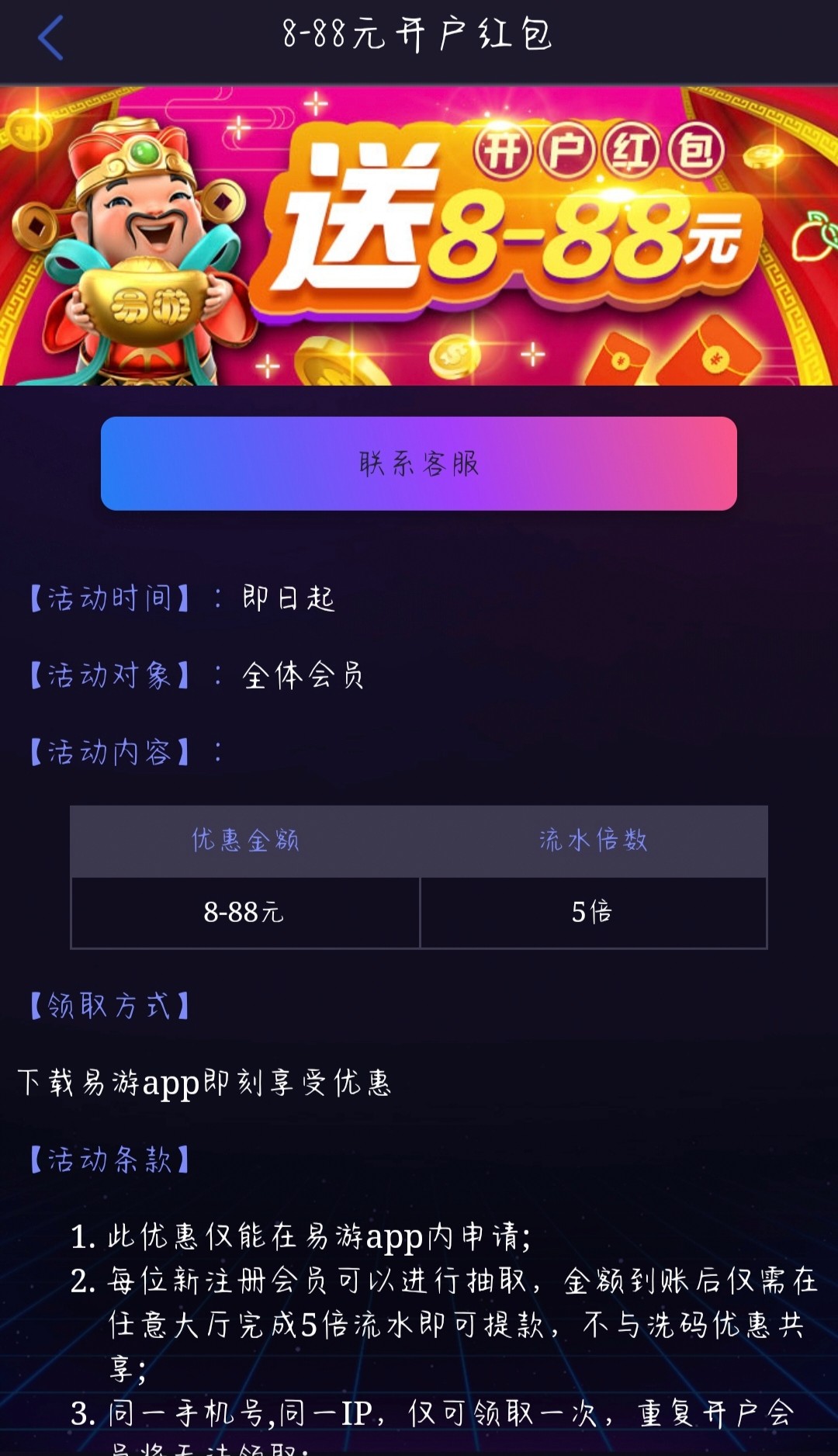 跟客服对线半个多小时,后来电话客服打电话过来,说我有双账号,让我保留一个,死不承认,客服没办法,最后才说体验金最高提330,,然后给我出了