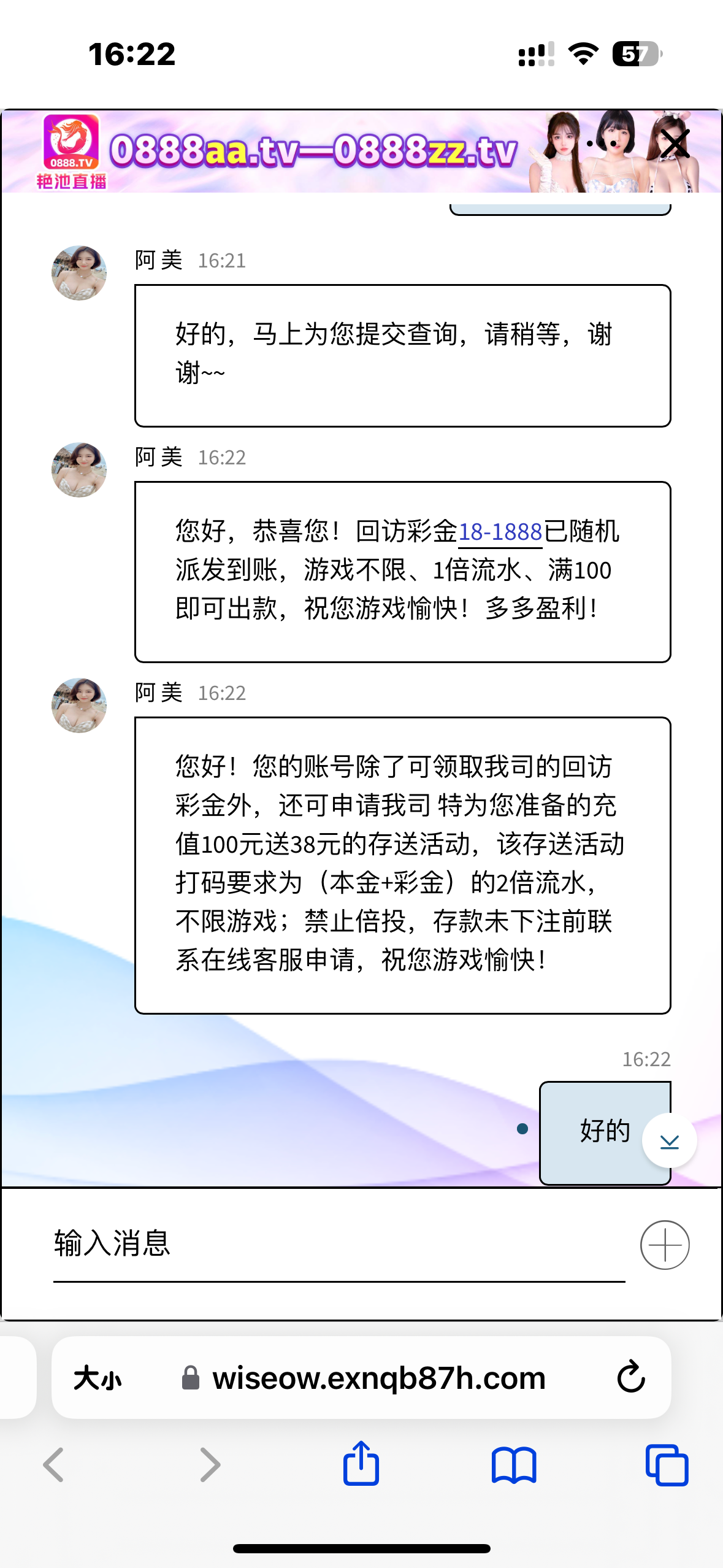艳池回访彩金送了58元
