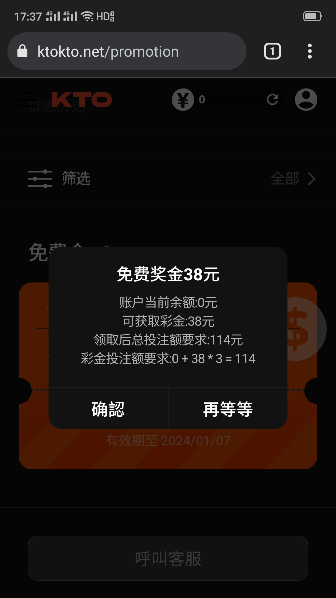 注册绑卡等回访送38,上个月注册的今天回访送了38,用手机号注册。网址ktokto.net