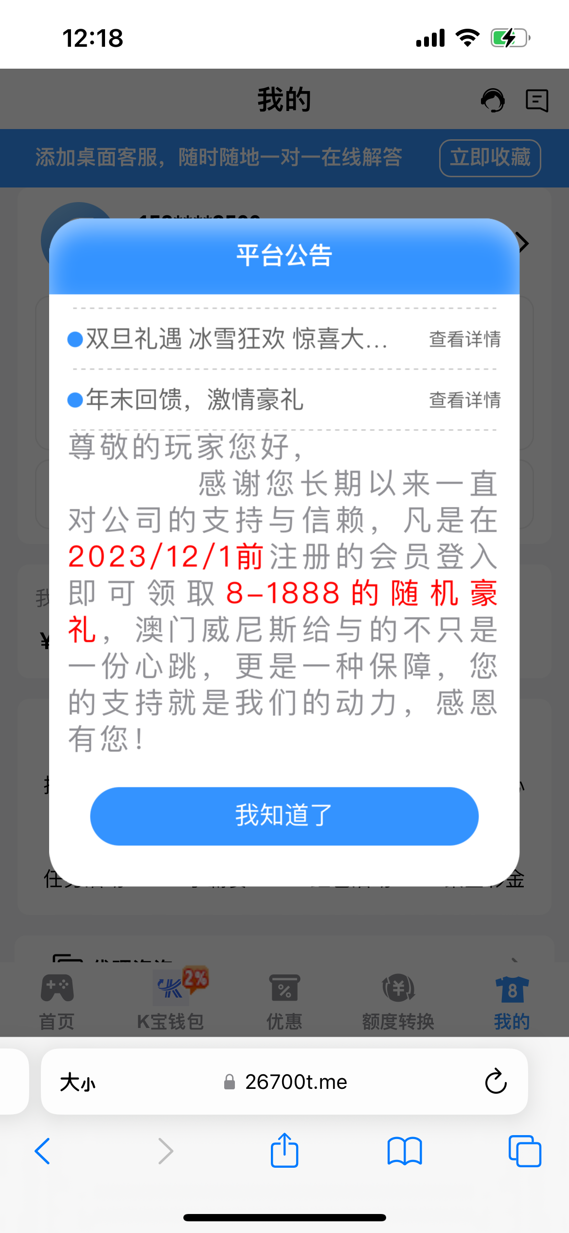打电话来的 上去有18 加了聊天软件客服 说有任意充值送58-588 存了100送了58 没看清楚 不让打电子 我玩了电子提260退回 罚我1300的水 限制打1-3分内开奖的彩票 过两关 打到了1000 怕提现黑 乱玩输下去400 流水够了提610秒到