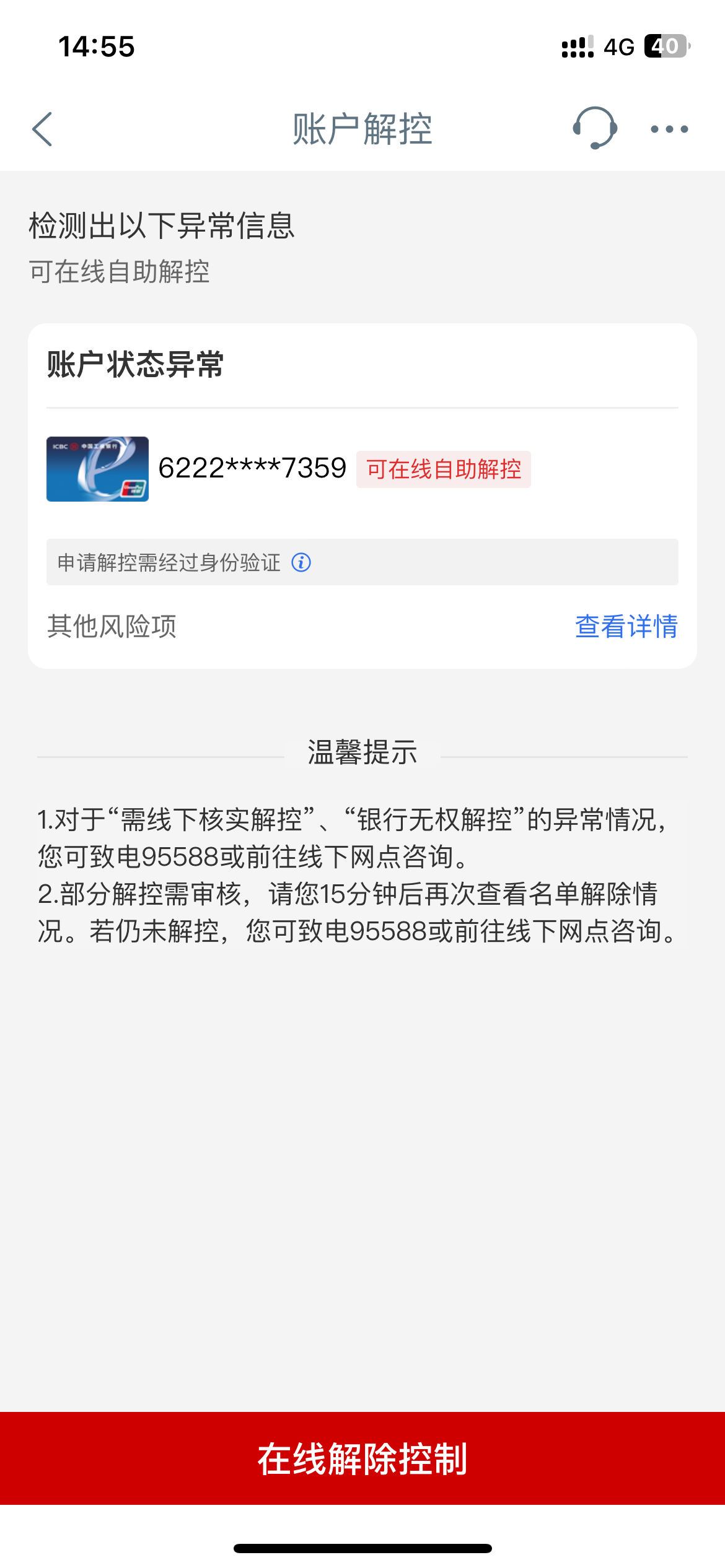 之前这个卡是一直发工资用的,后面快进快出,被冻结了,然后去反诈中心盖章,解除了一次,过了段时间快进快出,又封了,去银行客服说是快进快出原因。两年多了,现在看能在线解除,有人操作过吗?懂的来,成功打赏猪脚饭。