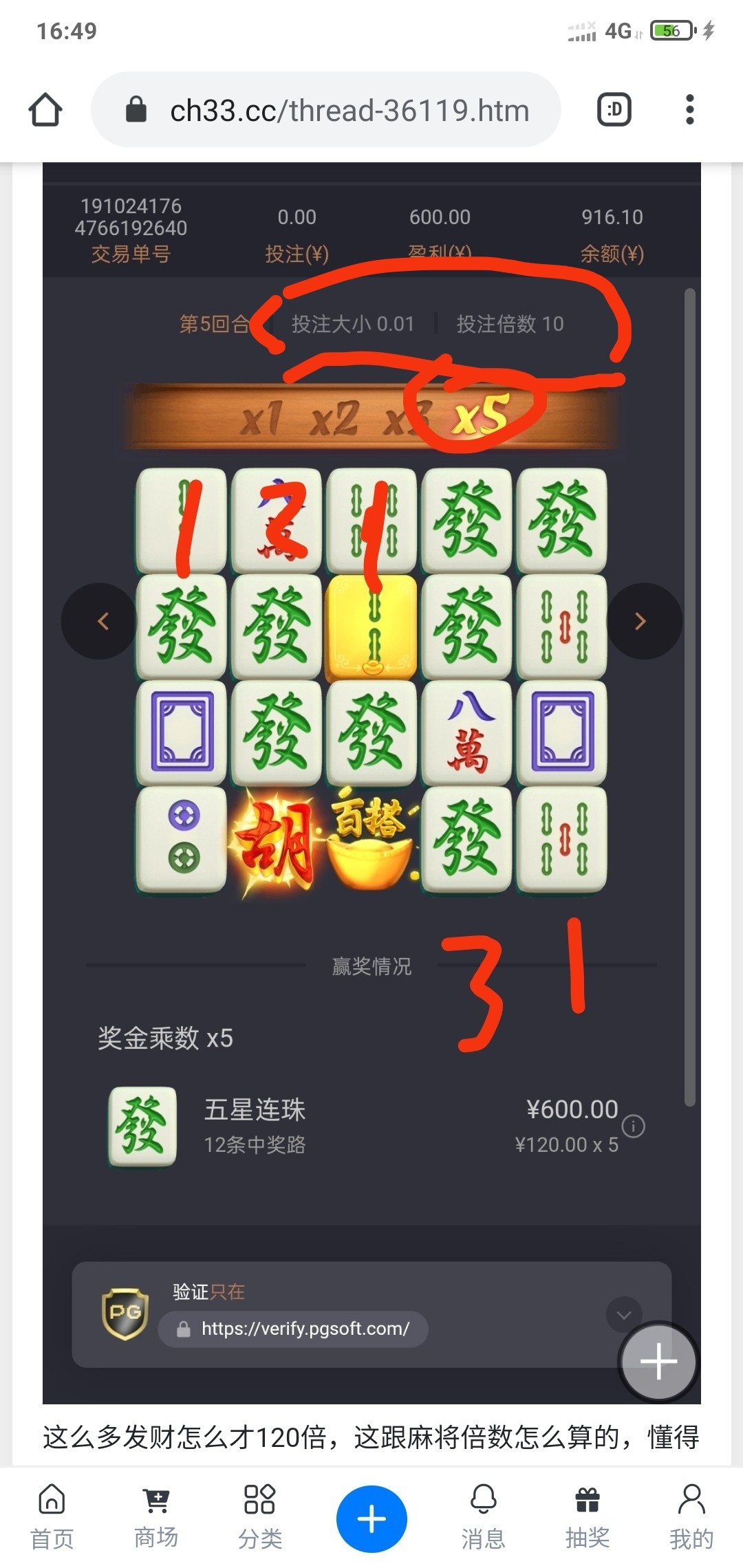 kobai1314 1*2*2*3*1*5*100*0.01*10=600,看图应该能看得懂吧,100是发财5路的倍数,0.01*10就是你投注2块的1/20,也可以是2*2*3*5*100*2÷2 ...