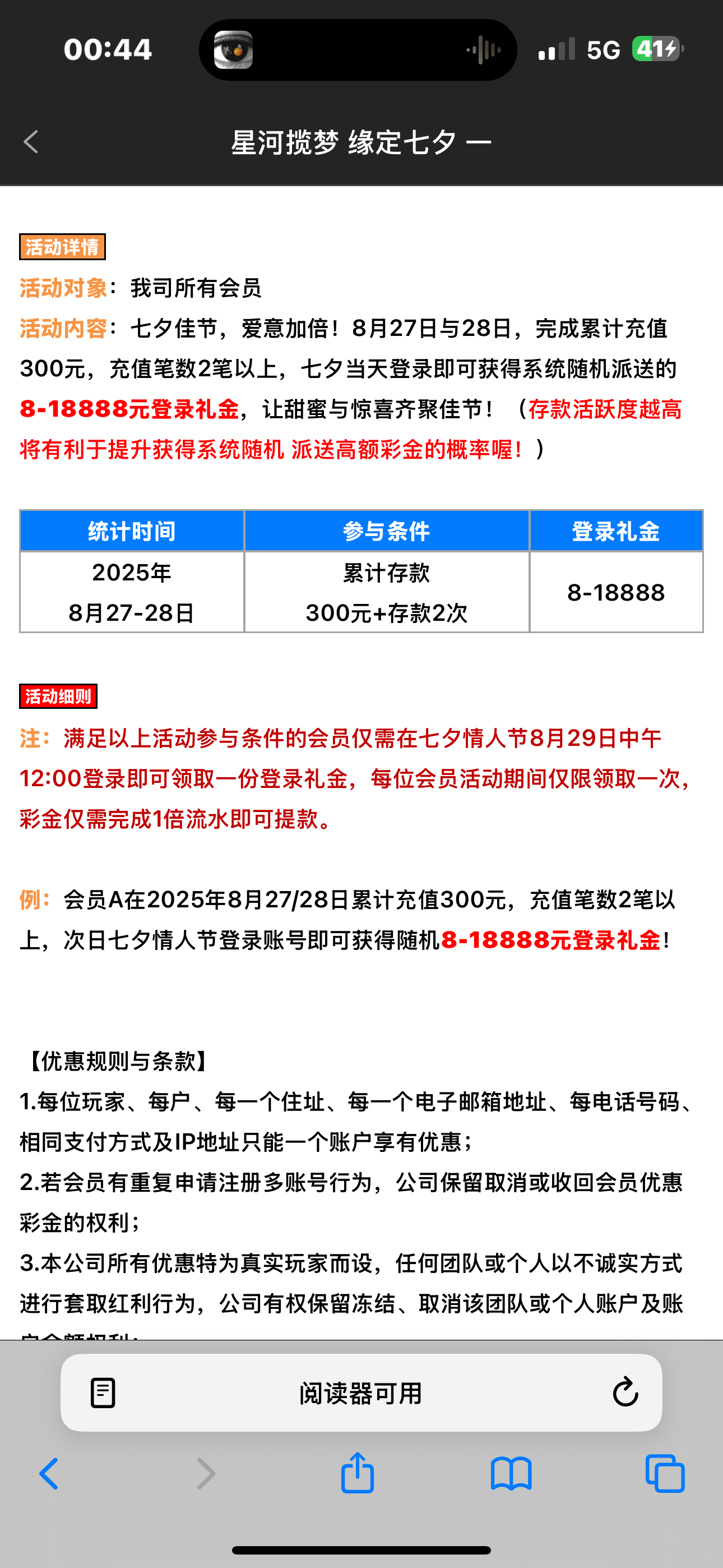 这个七夕彩金要不要上看情况吧 27-28号累计充值300就有8-18888 之前是送了388 应该有点格局 台子有50+50新人 小额三万以内我是没被黑过 看自己要不要上吧