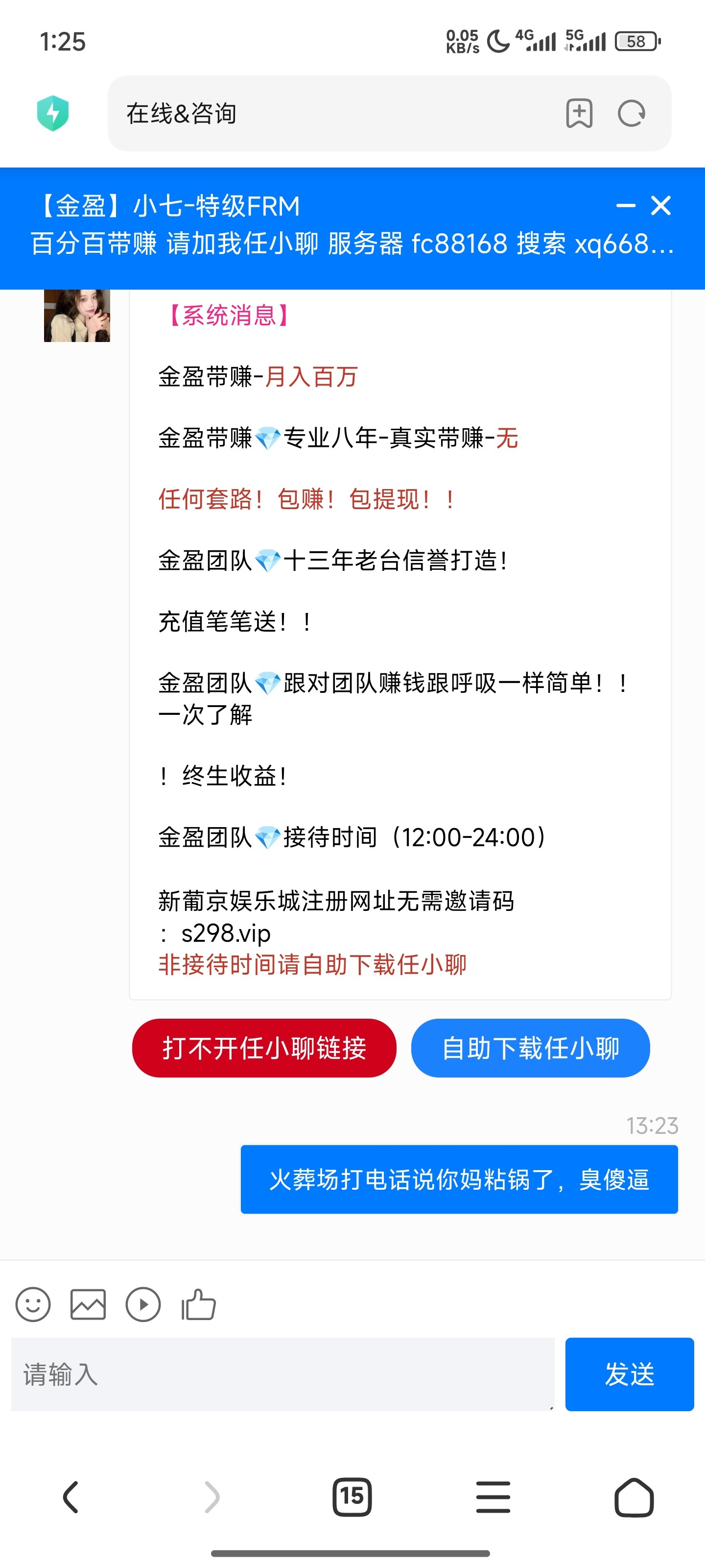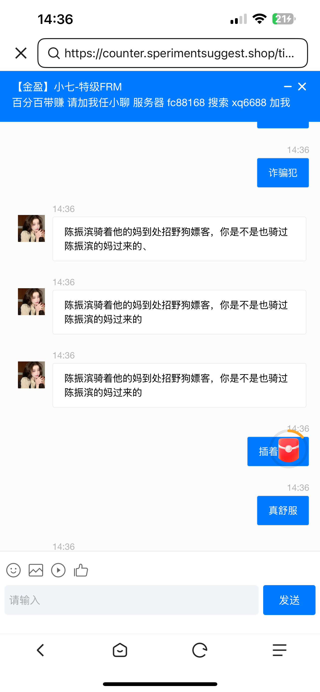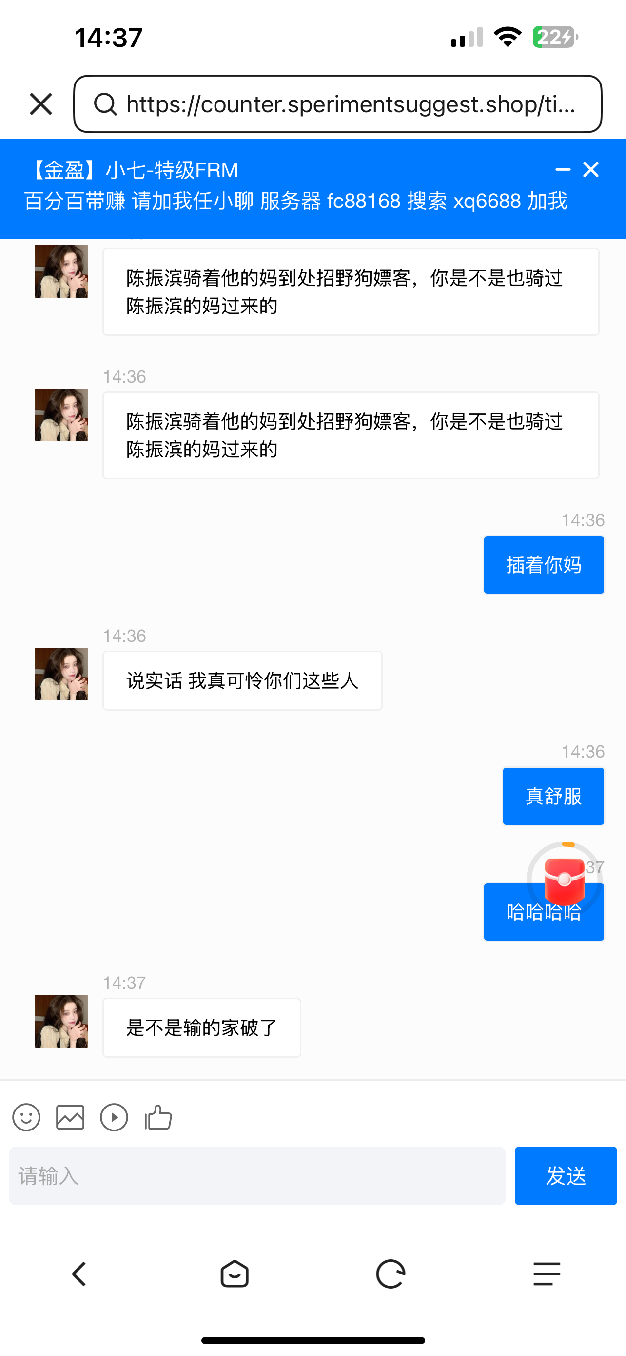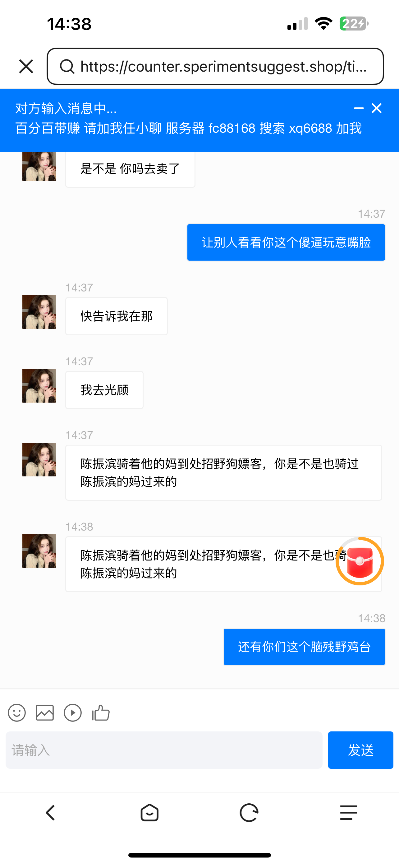 https://counter.sperimentsuggest.shop/tionally.html这个是客服链接,哈哈哈哈笑死我了狗急跳墙就验证码轰炸我。