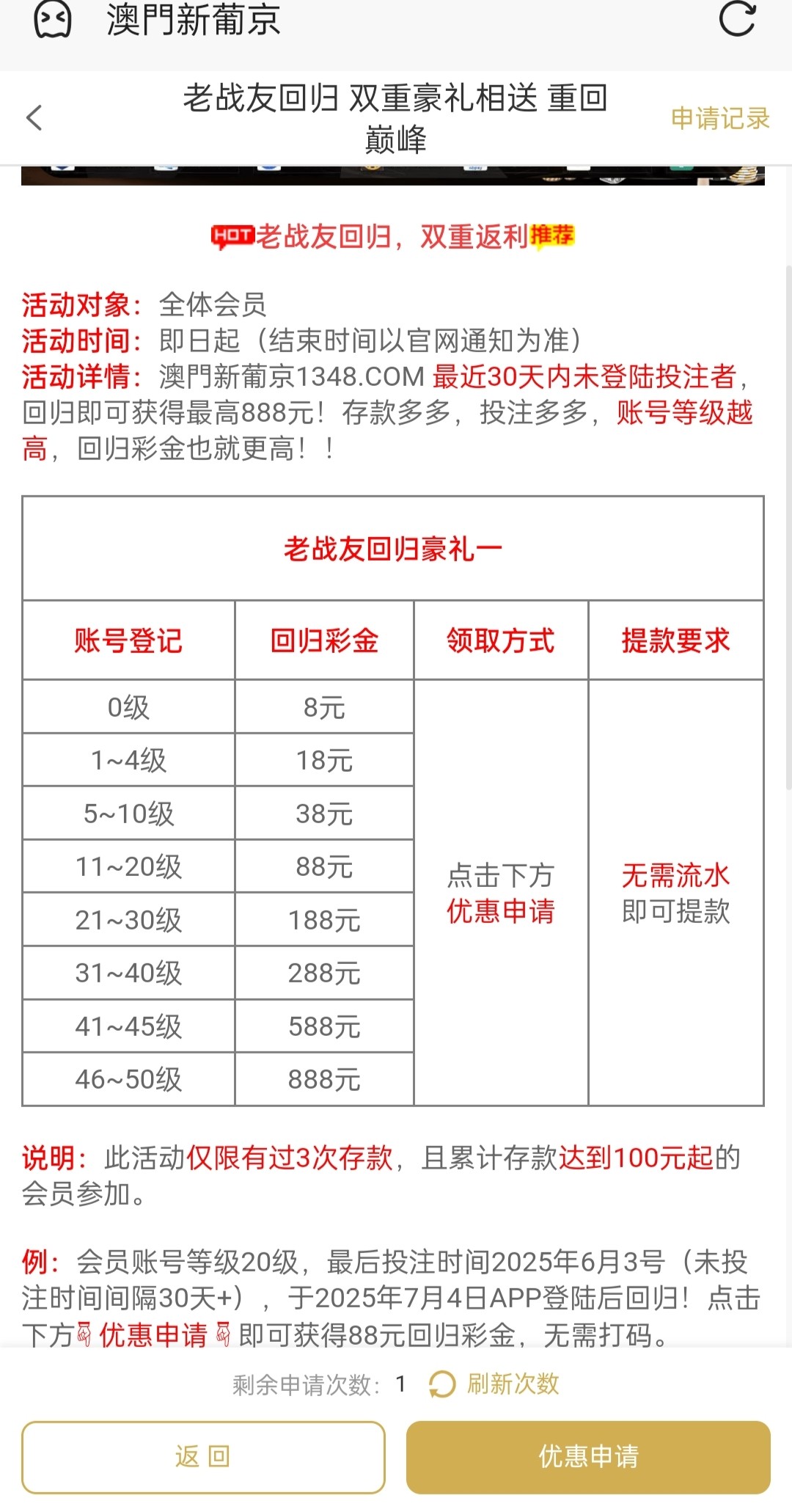 老用户历史有存款的登录优惠大厅自助申请彩金,具体规则看优惠吧,自测