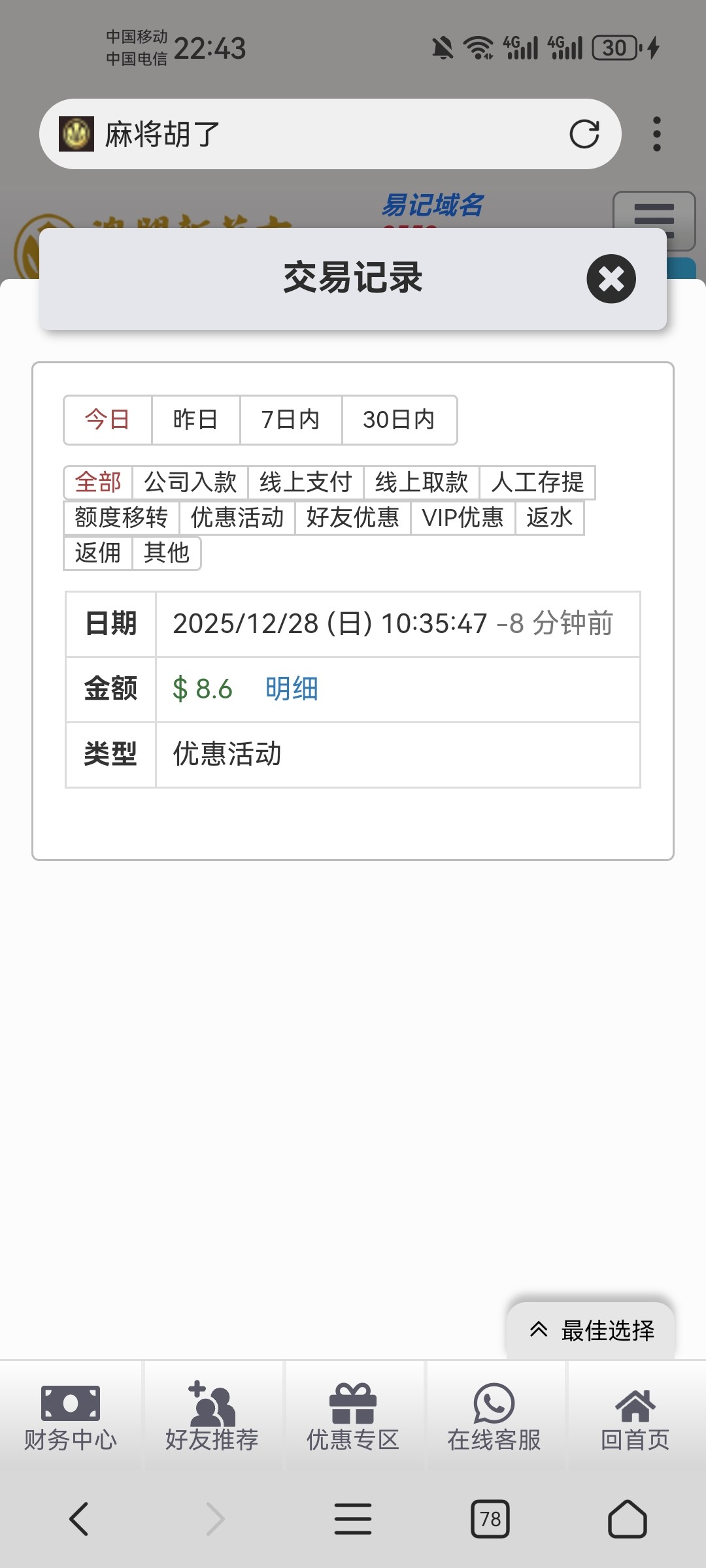 感谢你了,昨天被罚5水打完本金翻几翻盈利1600多,提出来只吃了个饭,又全部输回去,直接动都动不了了,今天也没心情去白嫖,但是肚子饿啊,身无分文又不想借钱,白嫖这188心情好多了,准备吃饭买烟!