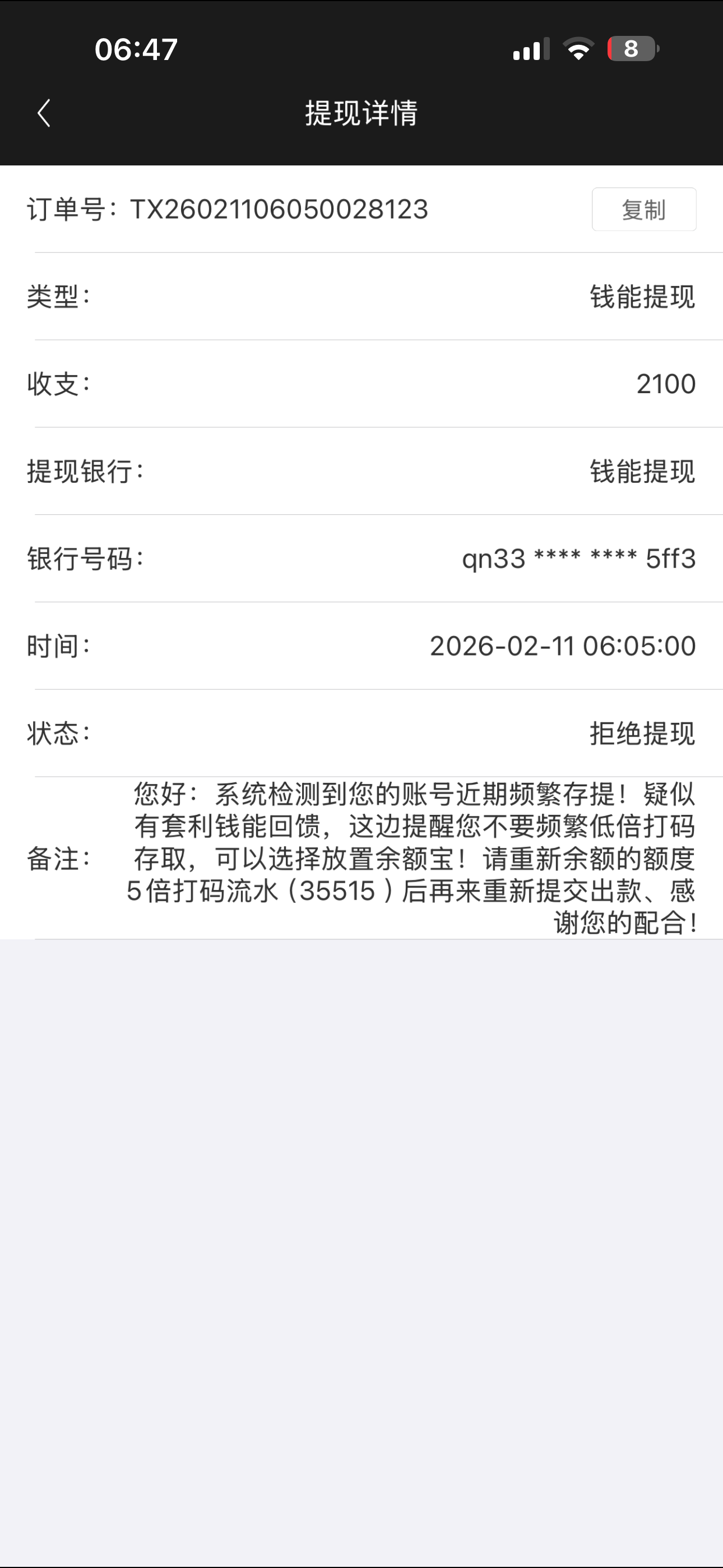 提少点,上次元旦回馈我几个月没充然后打到600罚3倍后面提900又罚5倍然后输到400没到水给出了