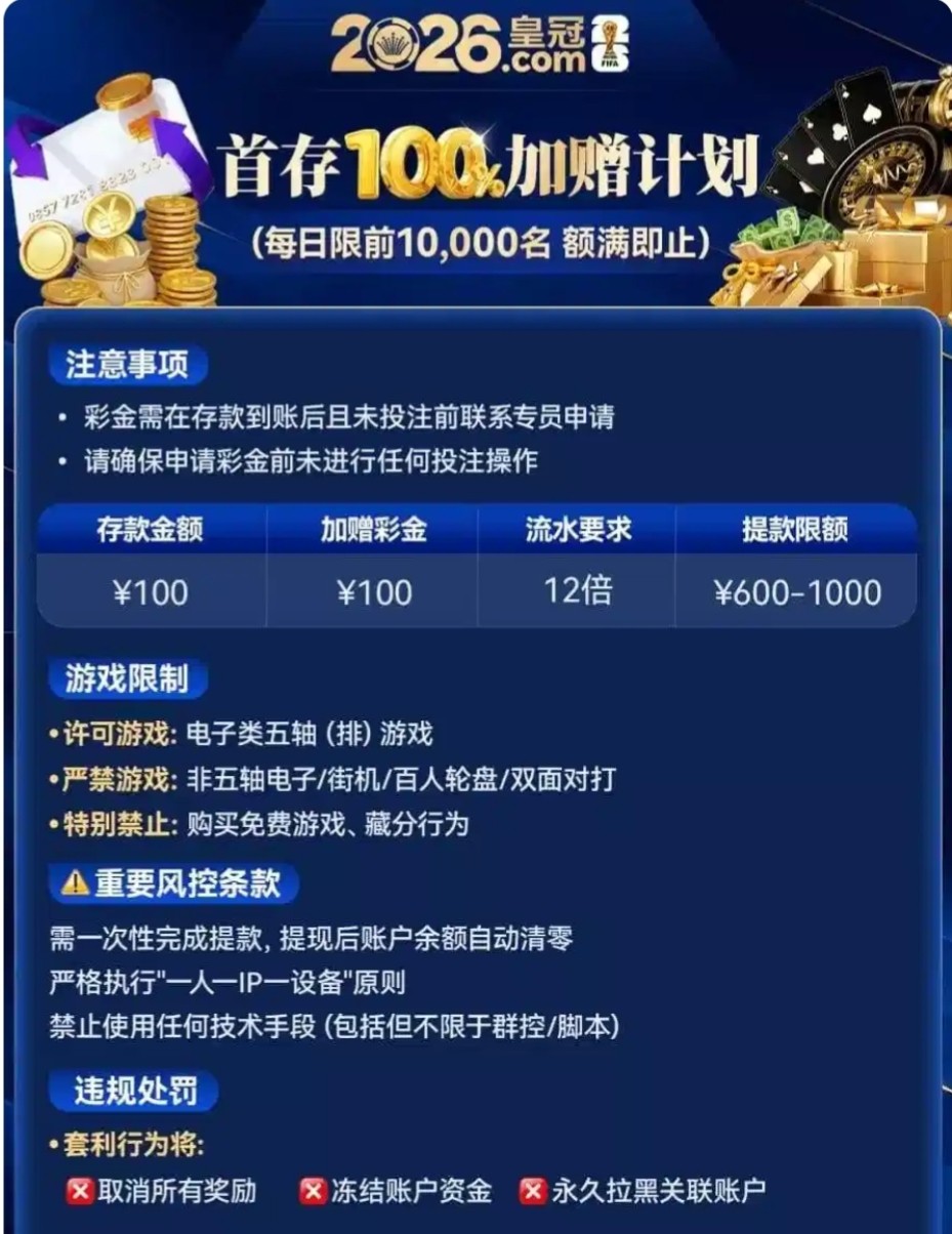 新用户首存100+100彩金: