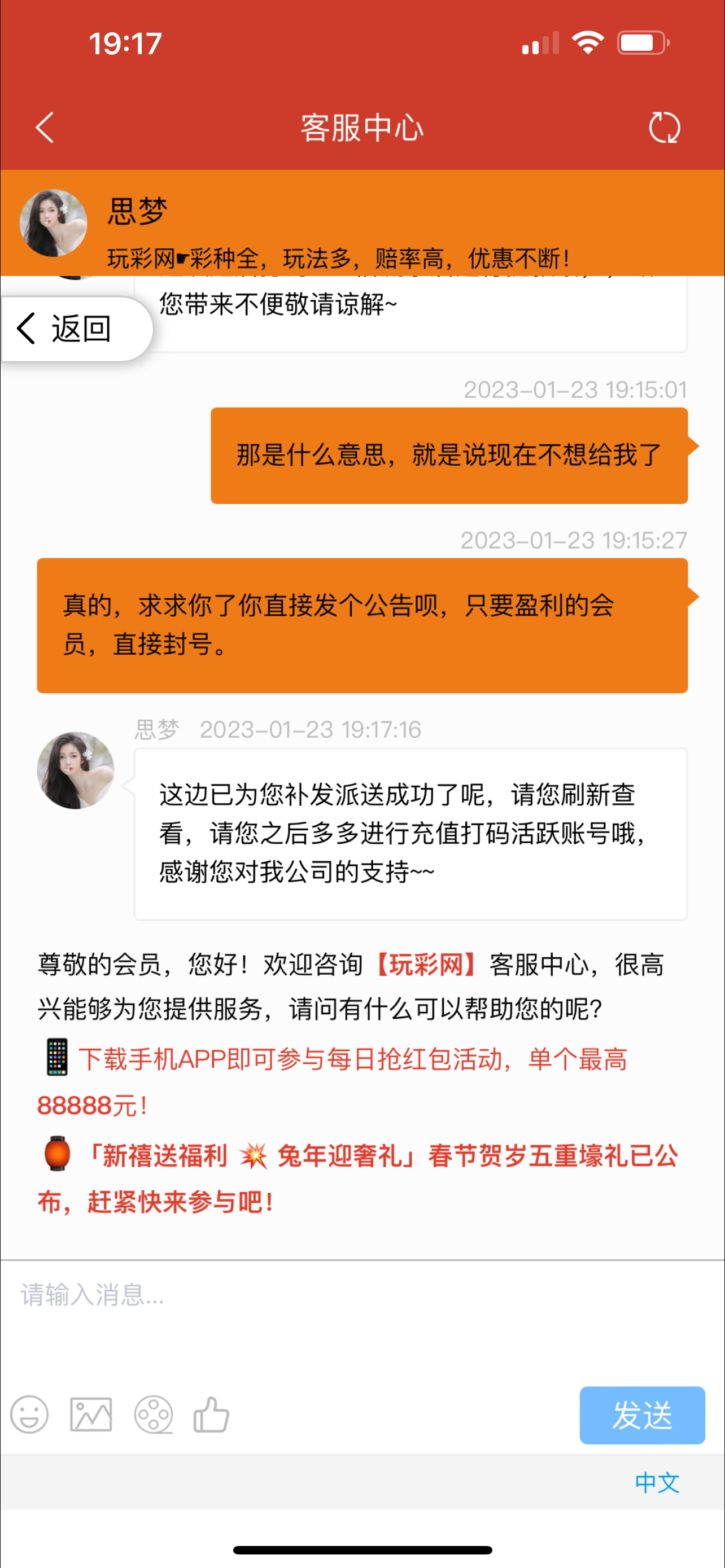 我玩这个系列也玩了三年多了最开始的时候是大众彩票跟玩彩网然后最后出了这个一系列的各种名称、你不活跃他就不给你抢红包,限制你的各种优惠就怕你少一天不充钱,都不给你任何优惠、而且只要你的帐号,一旦盈利平台就会要求你多打流水今天是10倍流水明天就20倍流水反正只是在互联网上提醒你们一下《玩彩网V15账号》