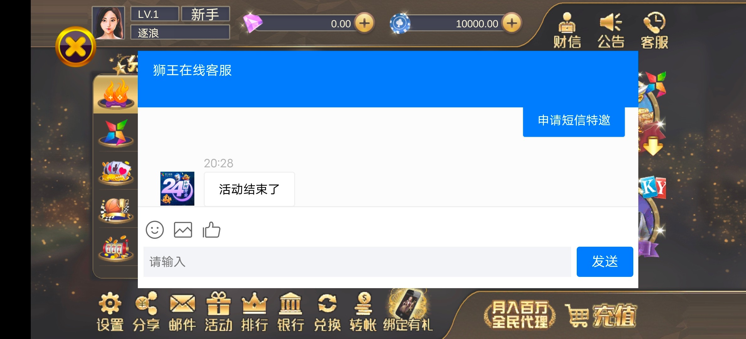 新用户注册自制特邀短信找客服送88/打到88的三倍金额下分58,目前不查。