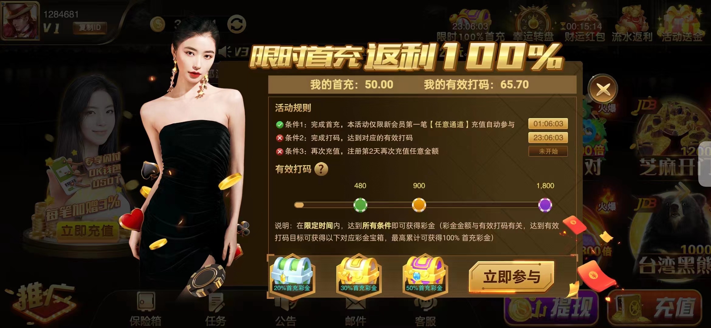 还行,登录直接送了18,打到100让充值提,充了50提200