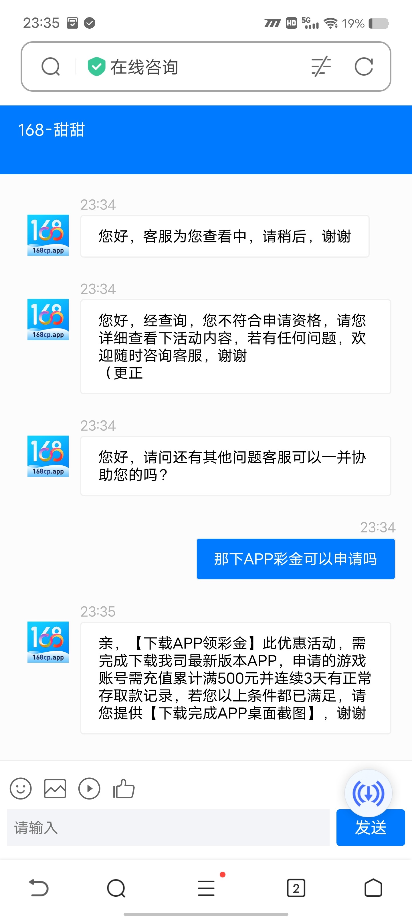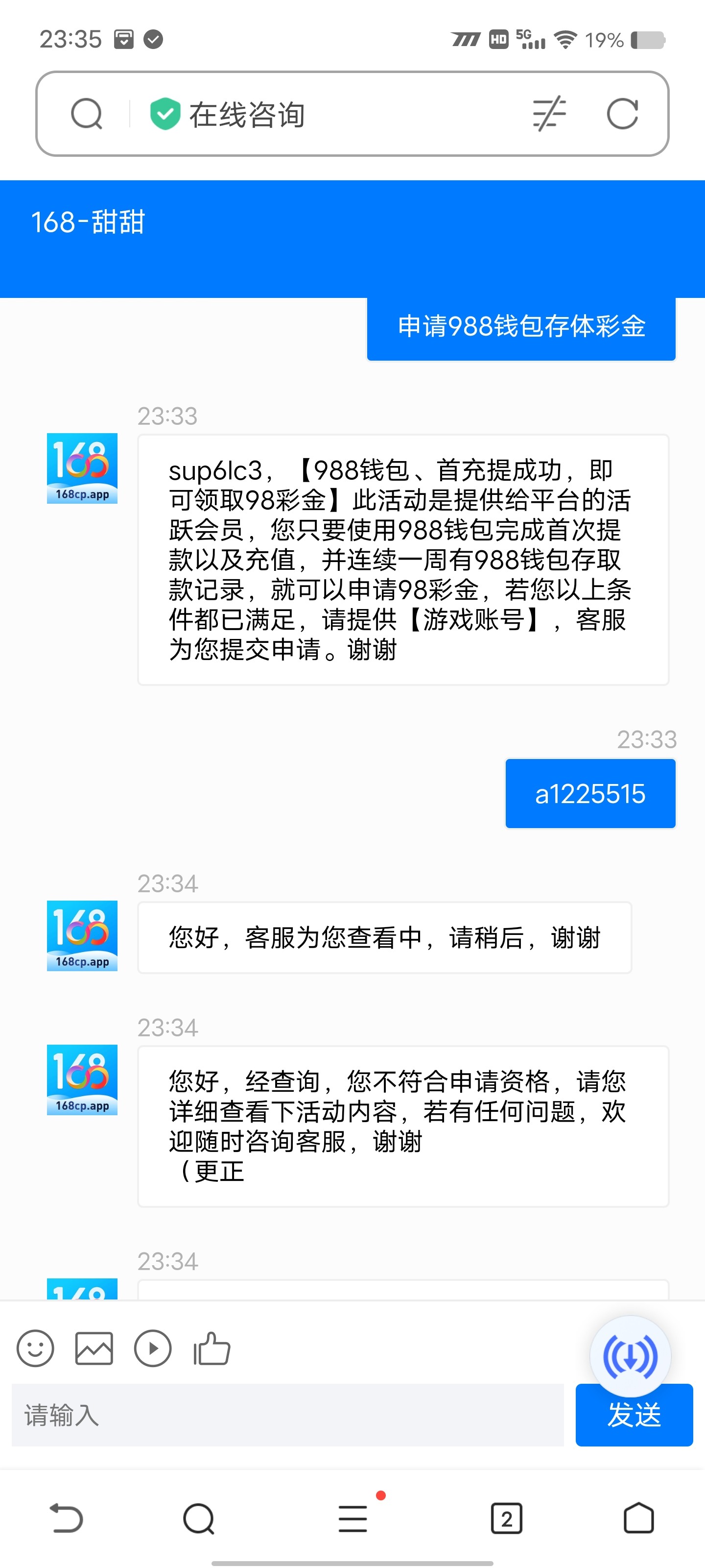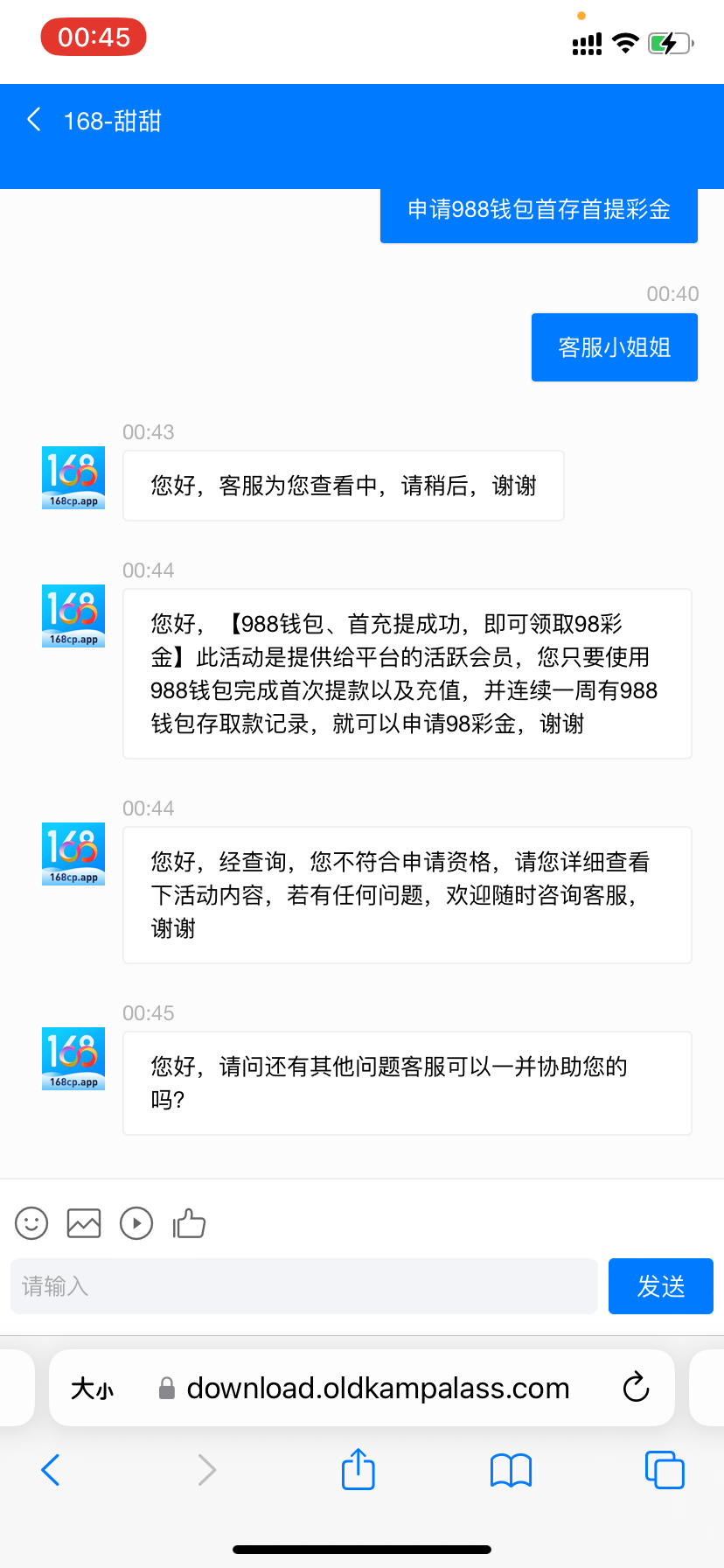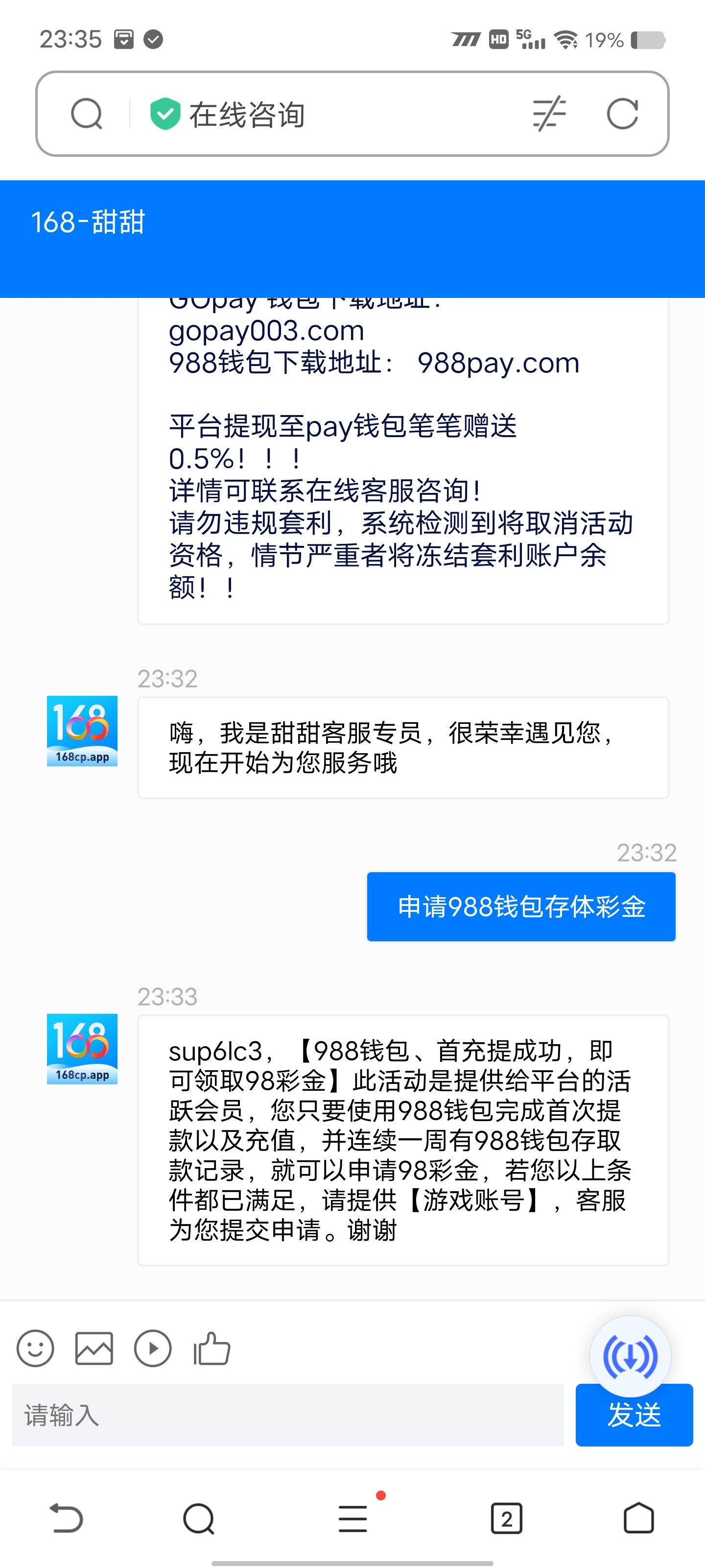 用988pay存取款一次 找客服送98 送的很慢 网址168100.app