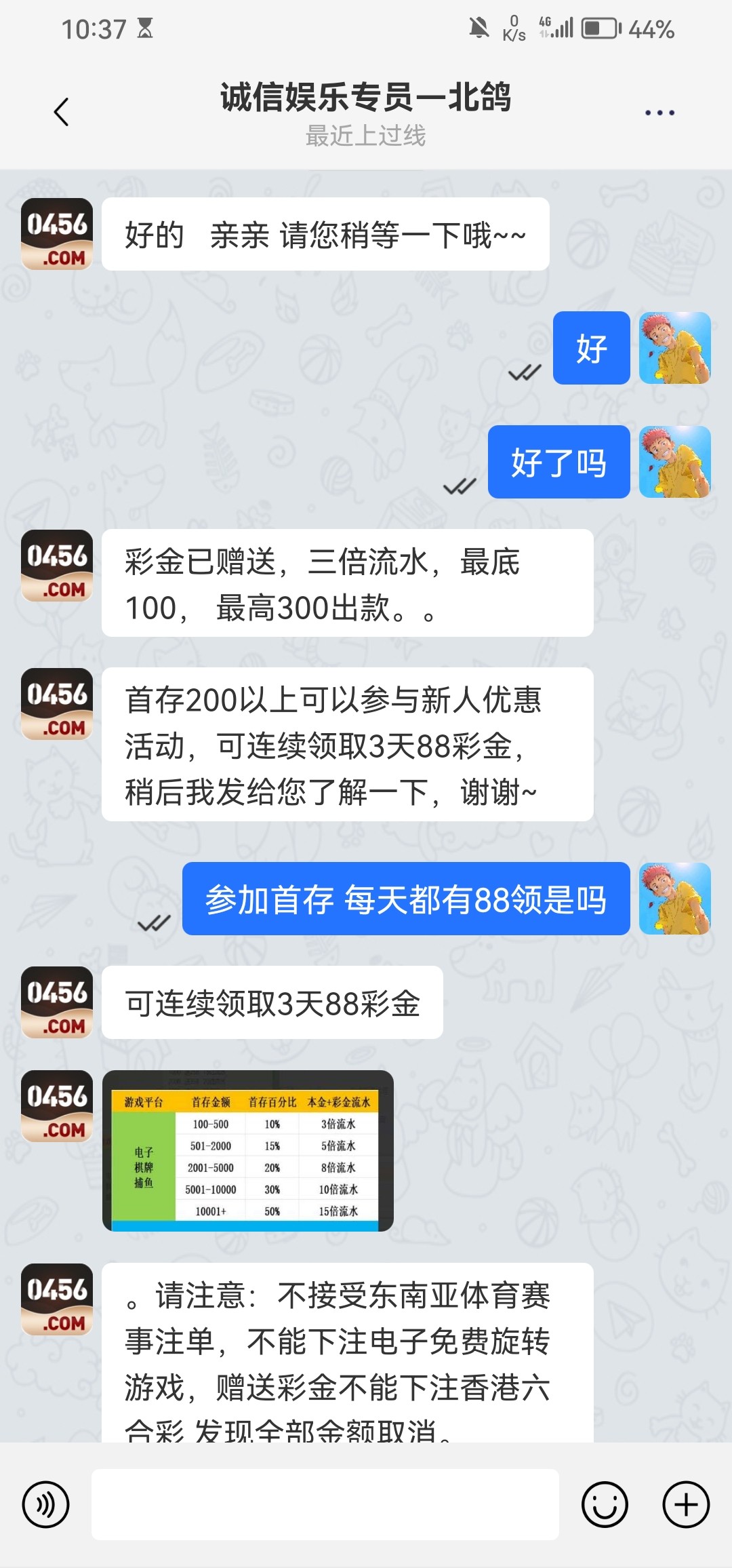 前几天收到电话特邀的 现在可以去加其他专员试试 我今天加了另一个专员又送了88 前几天的88出款271 今天的打没了