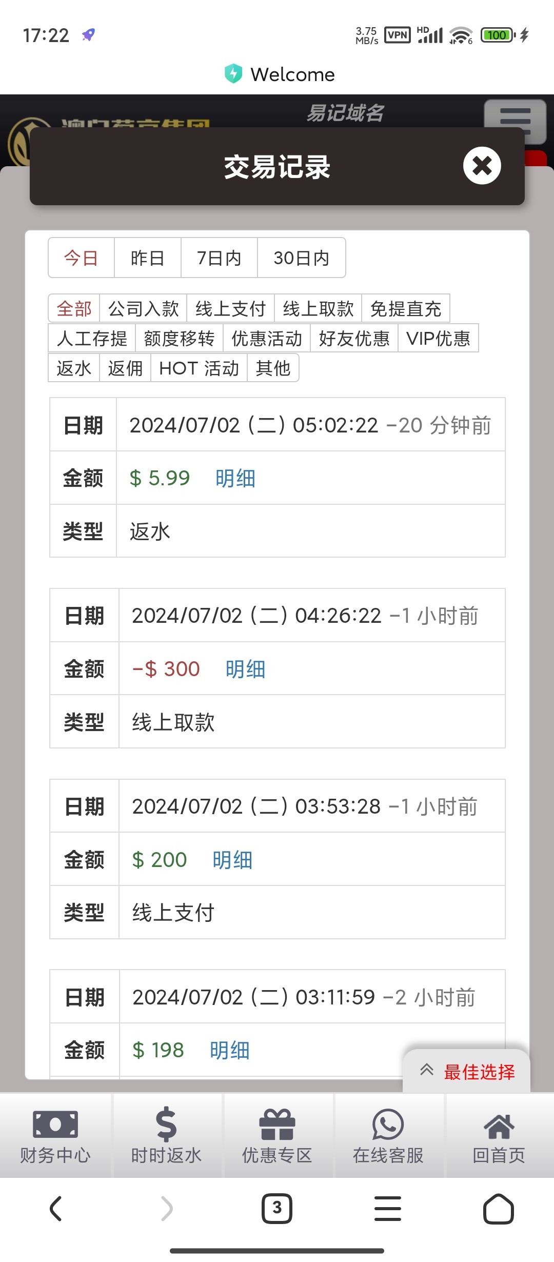 今天充100提了200反水10又提了200这个鸟台