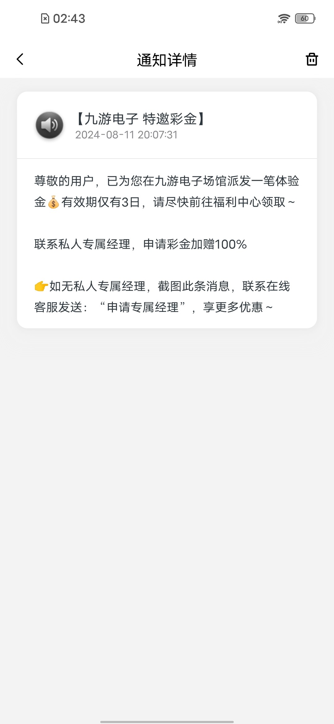 大家也可以去看一看站内信 有很多相似的信息不要完全看我这个图来 信息里面有提到加专属经理的话最少都有18彩金 加了申请专属彩金即可