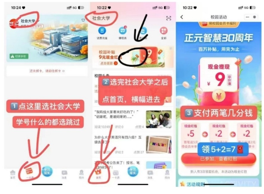 这个白嫖9元的,人人有赶紧去没有的来评论区骂我,应用商店下载易校园再去操作,一分钟不到简单5+2次日再领2r,看图操作选社会大学,学号什么都不用选,右上角可以跳过,后面绑定银行卡支付一毛多钱,支付两次第1天领到7块的反馈一下,谢谢了
