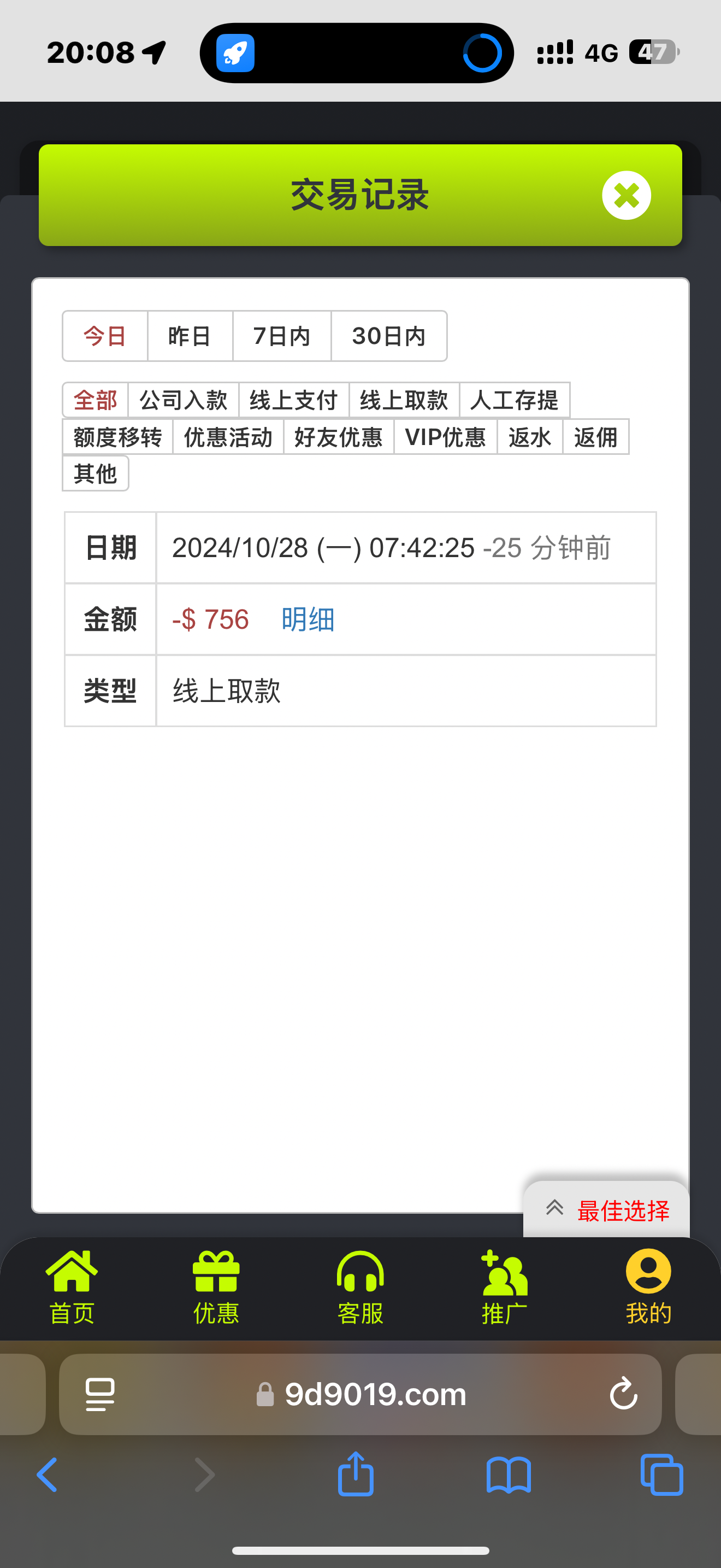 登陆上去有余额有123……我都不知道是什么回馈优惠,查看记录30天记录是空白的!打出来750提现到账