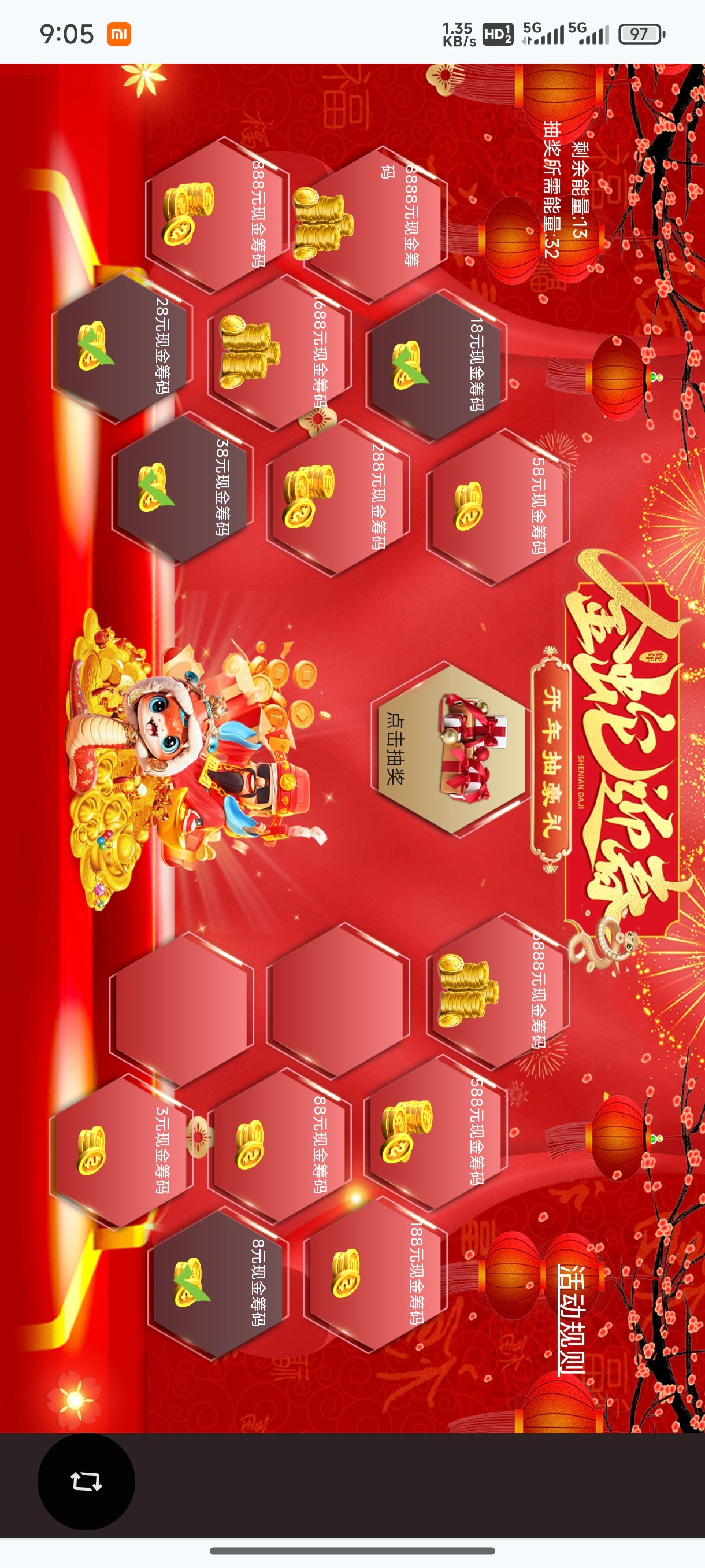 不是啊,他这个是500流水给你一个能量,然后后面抽奖,他那个能量消耗的会很快一直叠加。恶心的要死,我都抽了这么多次了,把小的全给我中了。