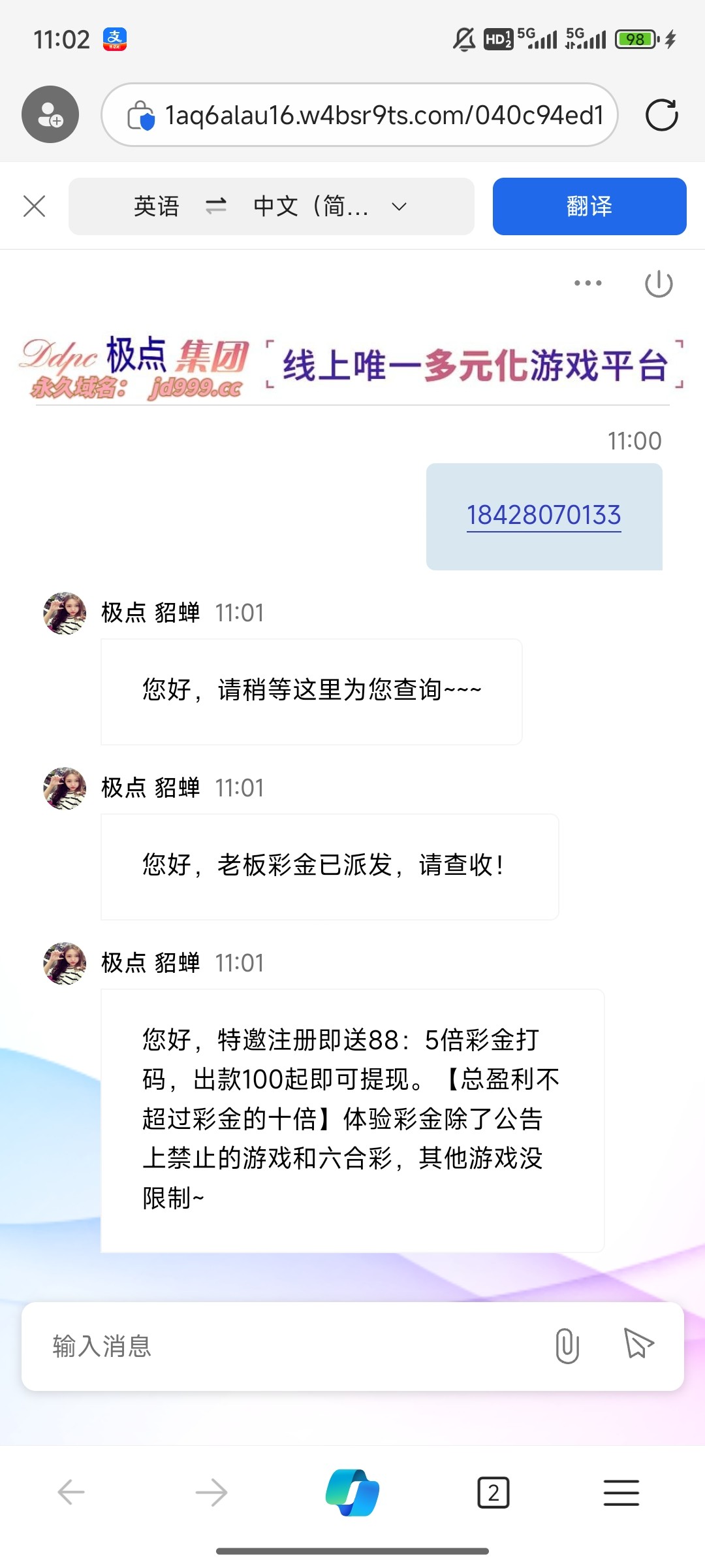 我两个手机号只有一个号收到了短信,结果两个都碰到了,都没打出来,出款自测。直接联系客服说收到短信报账号手机号,管理给我手机号打一下码