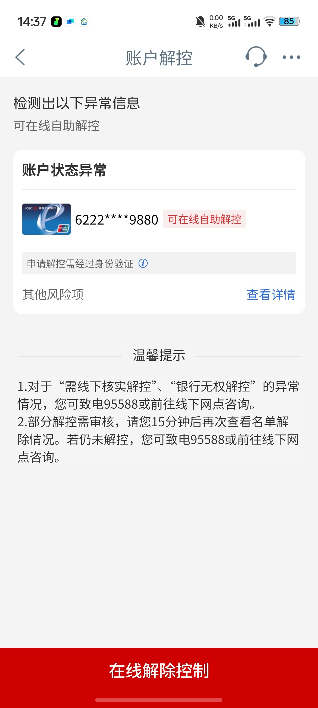 老哥你的几天了,我听别人说3天自动解除,我跟你情况一样
