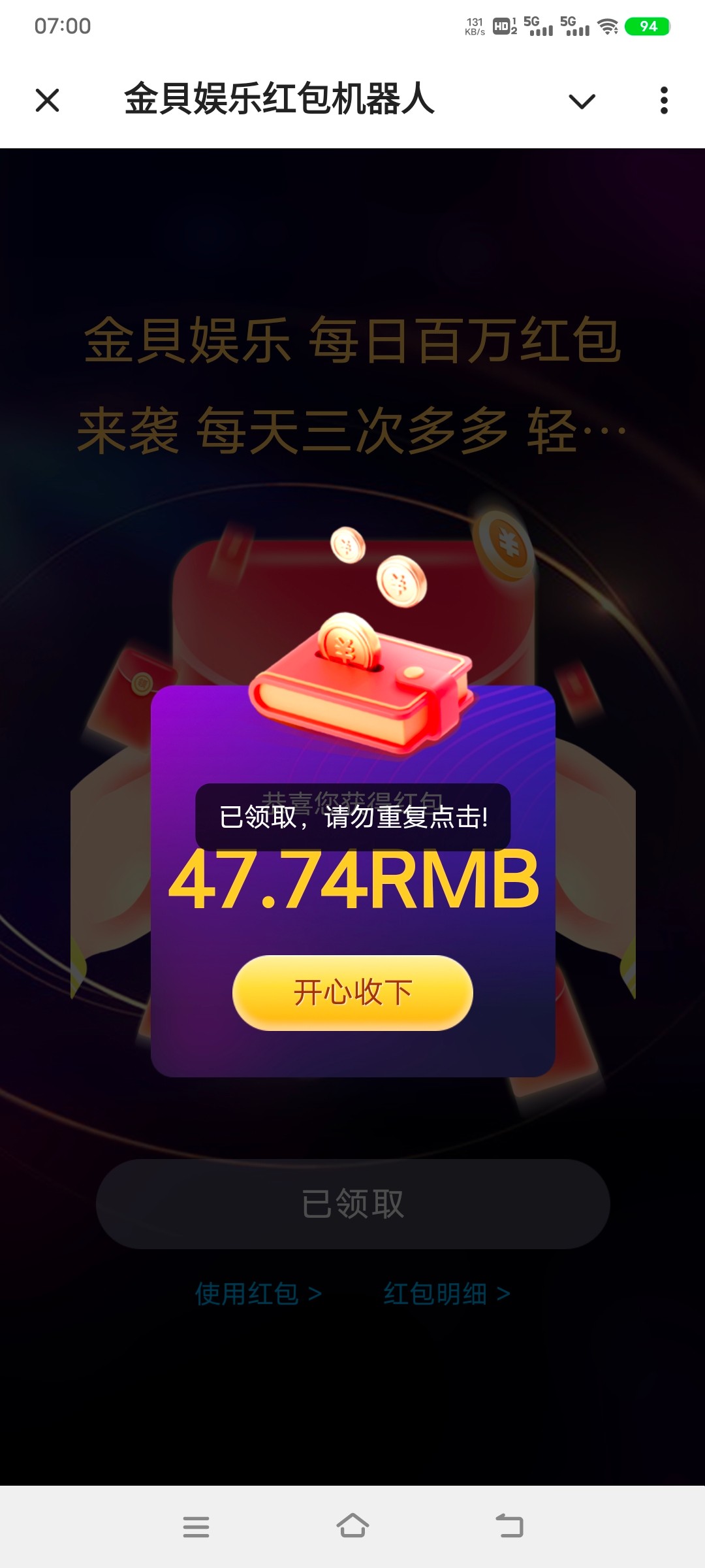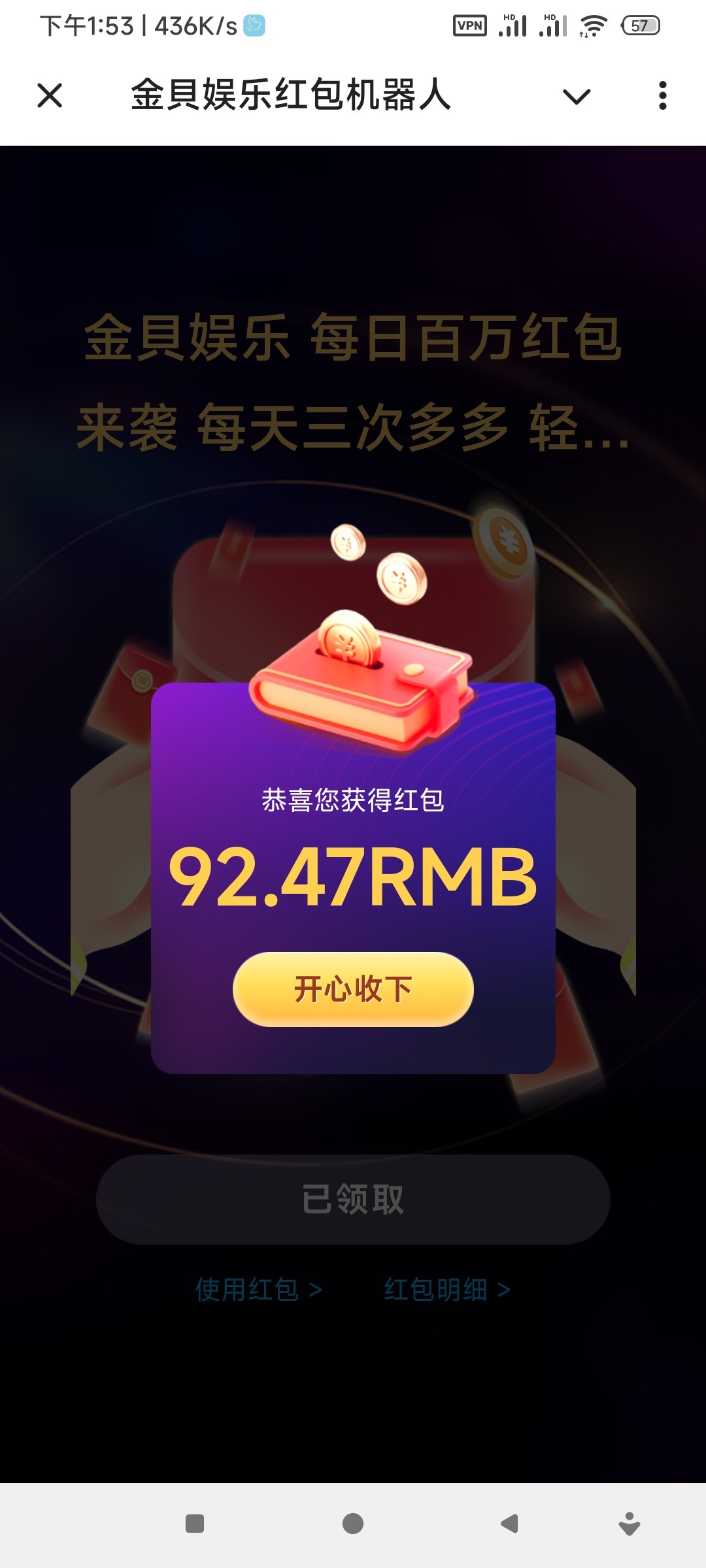 抢了47人民币,进游戏后6u多点儿,0 .2u拉麻将2炸了54,下分50已到账,有的老哥下分500u,几百u!
