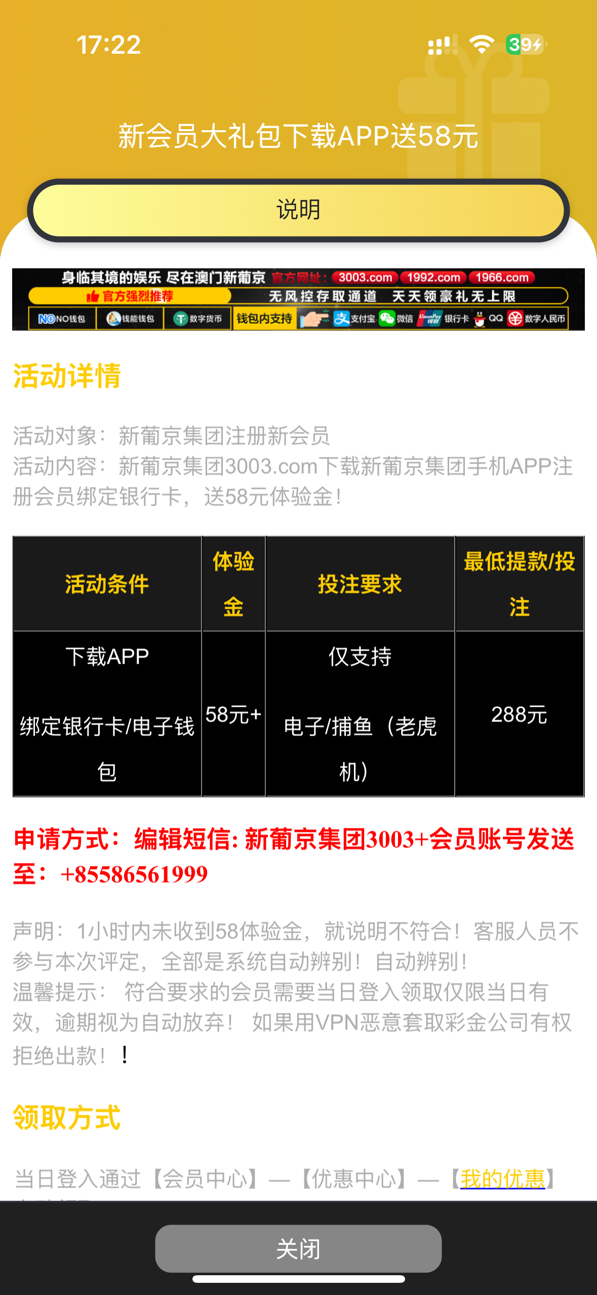 发短信领58