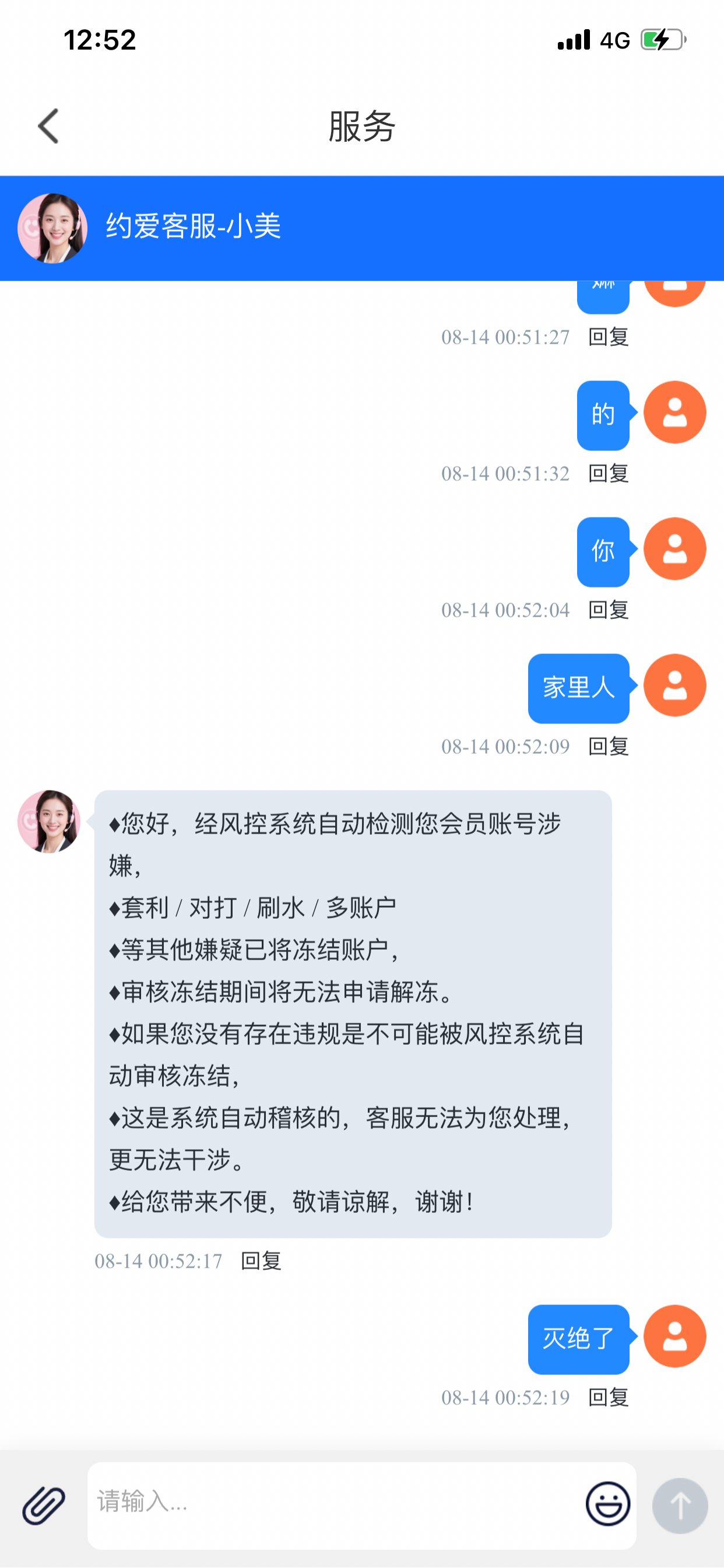 abc1 ♦您好,经风控系统自动检测您会员账号涉嫌,♦套利 / 对打 / 刷水 / 多账户♦等其他嫌疑已将冻结账户,♦审核冻结期间将无法申请解冻。♦如果您没有存在违规是不可能被风控系统自动审核冻结,♦这是系统自 ...