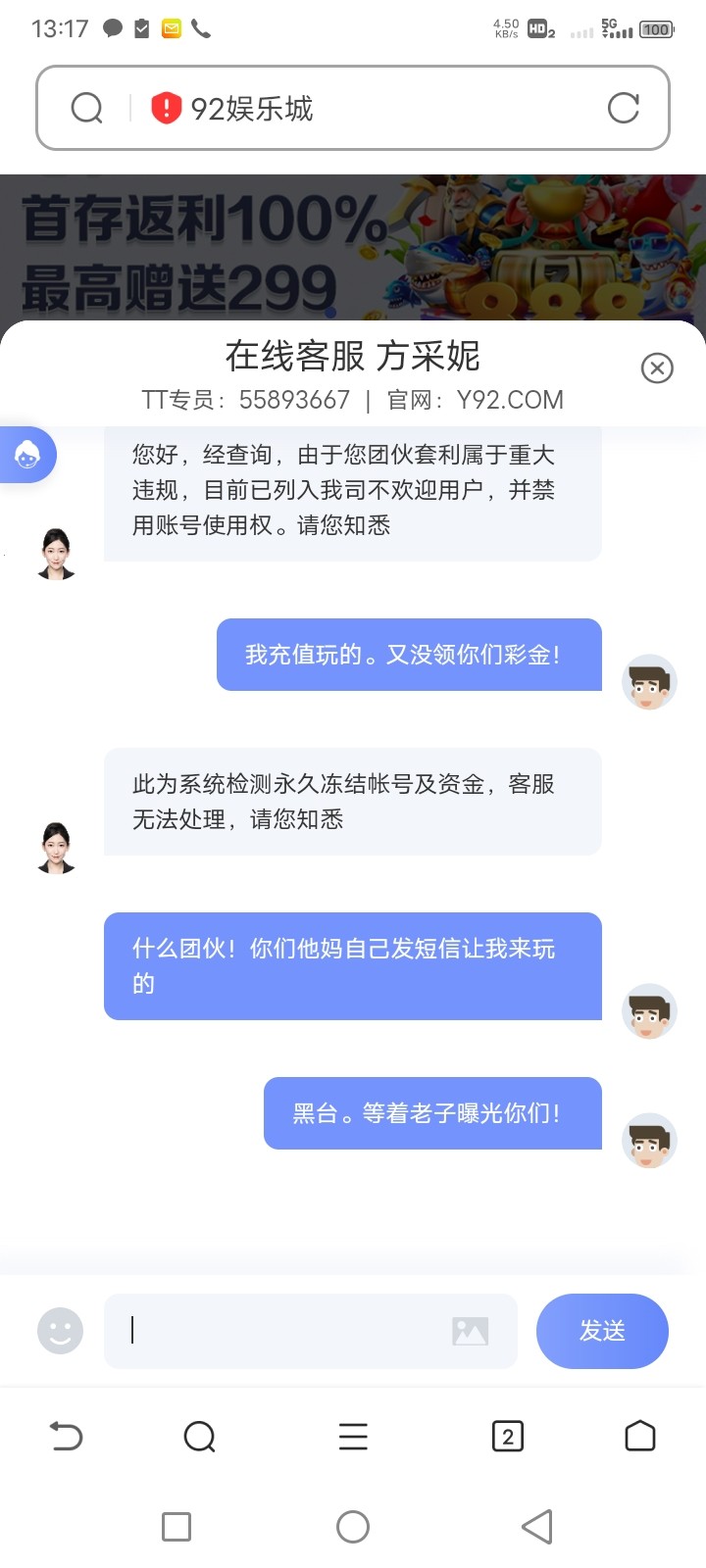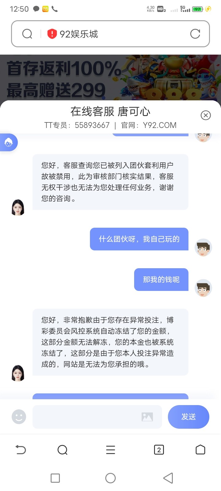 冲300没领彩金玩,提400被退回然后找客服,就被封号,